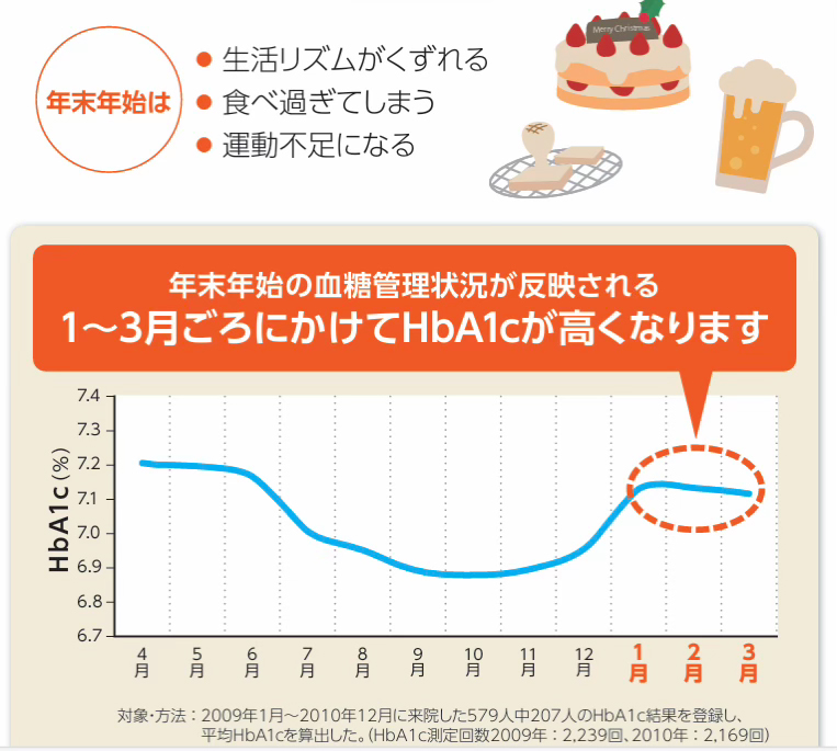 HbA1cは、過去1~2ヵ月の平均血糖値を反映するため、年末年始の過ごし方は1~3月頃のHbA1cに反映されます。1年間上手に糖尿病と付き合っていけるよう、日常生活の習慣を振返り、食事内容を見直したり、体を動かすことを意識してみましょう!